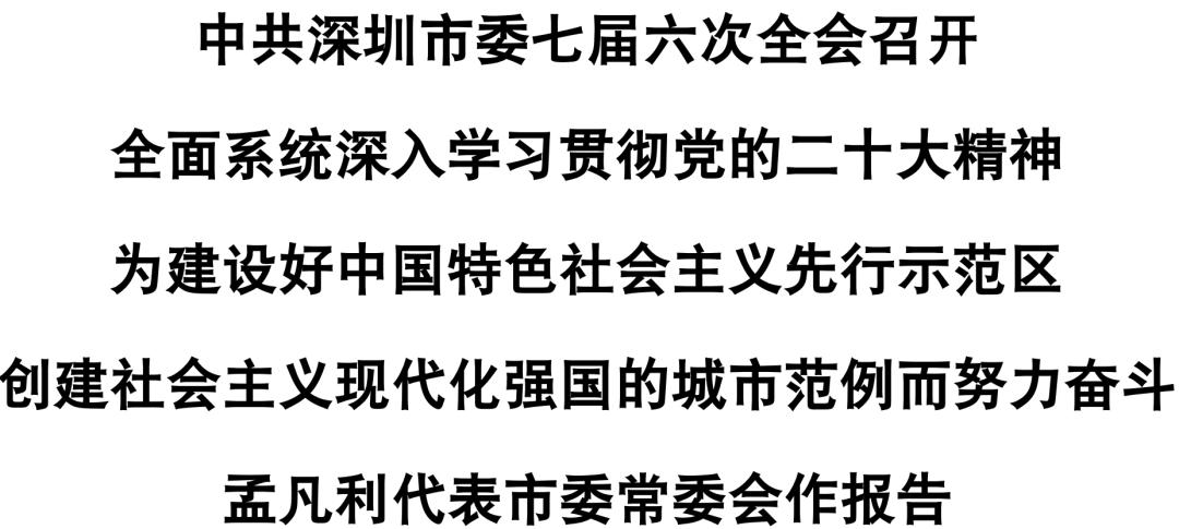 12月26日,中国共产党深圳市第七届委员会第六次全体会议召开。会议的主要任务是:以习近平新时代中国特色社会主义思想为指导,全面系统深入学习贯彻党的二十大精神,深入学习贯彻习近平总书记对广东、深圳系列重要讲话和重要指示精神,贯彻落实中央经济工作会议精神,坚定拥护“两个确立”、坚决做到“两个维护”,弘扬伟大建党精神,坚定扛起习近平总书记、党中央赋予深圳的新时代历史使命,按照省第十三次党代会和省委十三届二次全会部署,动员全市上下埋头苦干、奋勇前进,坚定不移走好中国式现代化之路,为建设好中国特色社会主义先行示范区,创建社会主义现代化强国的城市范例而努力奋斗。市委书记孟凡利代表市委常委会作报告。