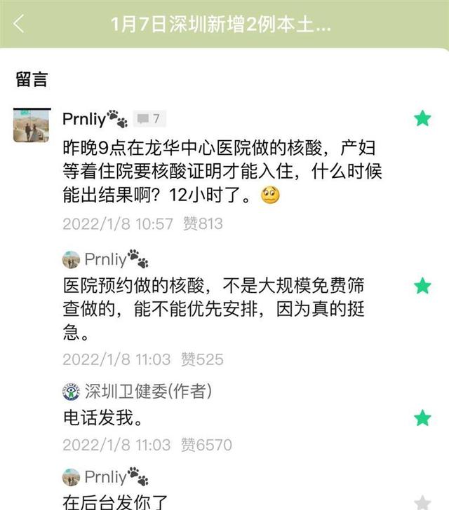 1月8日,一位网友在广东深圳市卫健委公众号文章评论区留言反映孕妇没有核酸证明无法住院,深圳卫健委回复“电话发我”,在收到孕妇名字和身份证信息后,工作人员立即联系了龙华中心医院,医生把孕妇信息提出来优先上传,就这样快速解决了。网友们纷纷点赞,表示这是“2022年目前看到最霸气的四个字”。