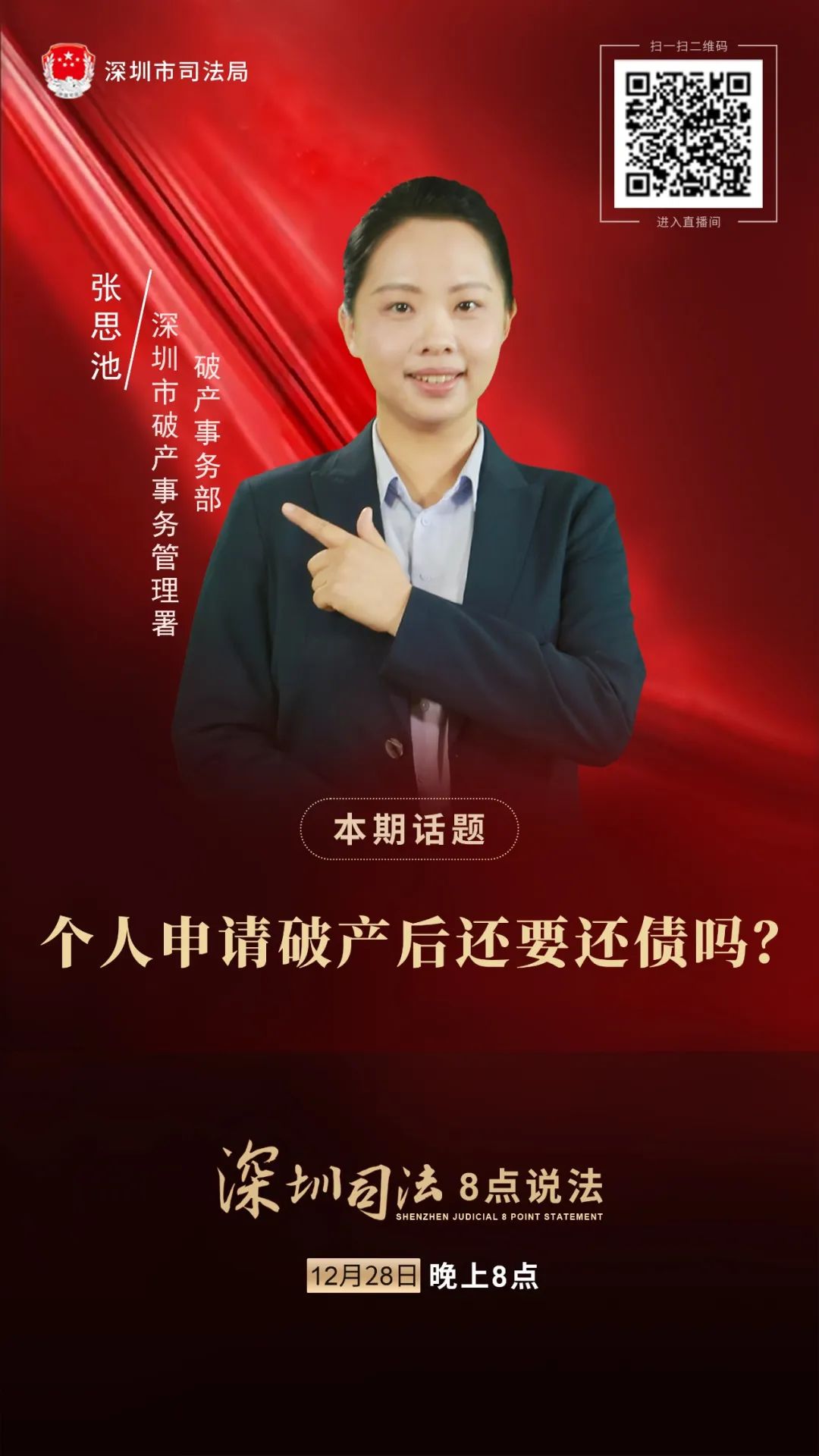 今天(12月28日)晚上8点《深圳司法·8点说法》直播间,深圳市破产事务管理署破产事务部副部长张思池将和大家聊一聊,个人申请破产后还要还债吗?