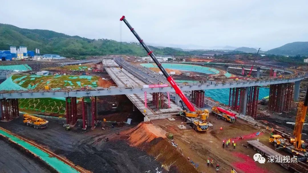 当前,深圳市深汕特别合作区正调焦聚焦、奋力打造“新一代世界一流汽车城”,加快建设与汽车城相配套的交通基础设施。近日,连接通港大道、鹏兴大道这两条城市主干道的鹏兴立交,继完成场地平整、桥梁下部结构建设内容后,又完成了全线钢梁安装工作,全面进入桥梁上部结构预制桥面板安装施工阶段。