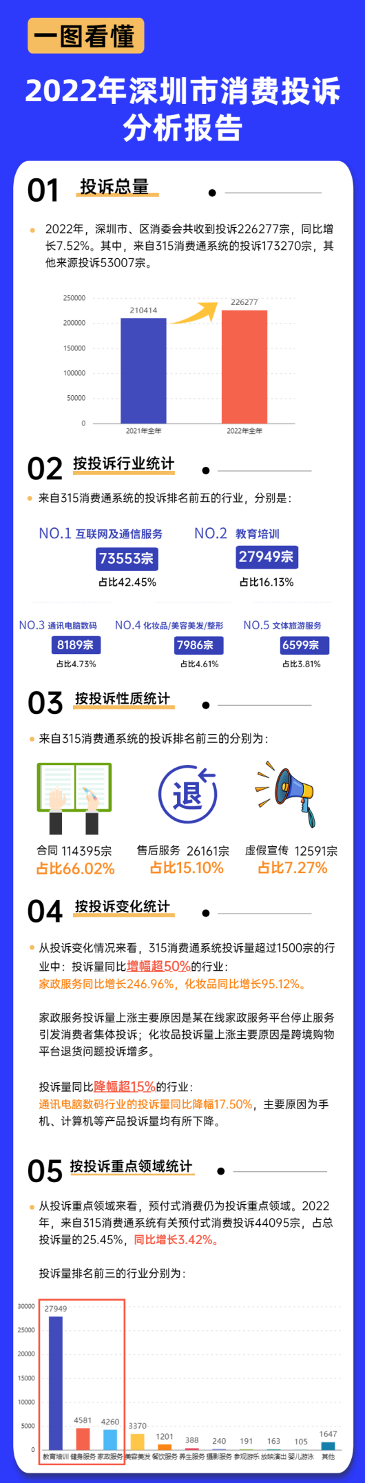 读特客户端·深圳新闻网2023年2月7日讯(记者 田志强)2月6日,深圳市消费者委员会发布2022年深圳市消费投诉分析报告。报告显示,2022年,深圳市、区消委会共收到投诉226277宗,同比增长7.52%。其中,来自315消费通系统的投诉173270宗,其他来源投诉53007宗。