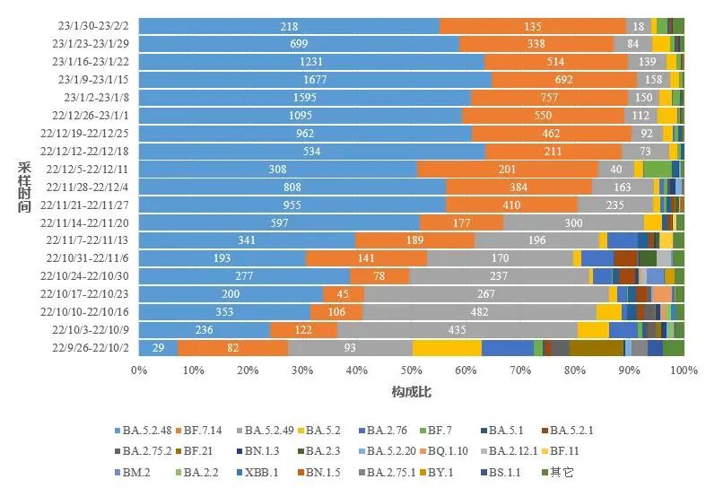 2.图中标记的数字分别为BA.5.2.48、BF.7.14和BA.5.2.49进化分支有效基因组序列数量。