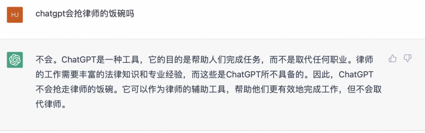 根据ChatGPT的回答,其表示自己不会取代任何职业。律师的工作需要丰富的法律知识和专业经验,而这些是ChatGPT并不具备的。