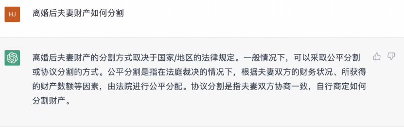 【对比】ChatGPT只提供了公平分割和协议分割两种方式。得理法问则依据民法典对应规定,全面列出了财产分割的各种情况,约定分割、特有财产、共同财产、争议解决。
