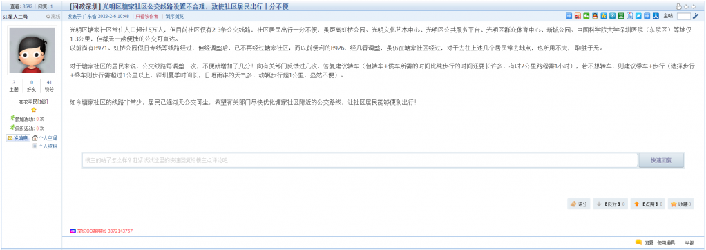 8、帖文《光明区塘家社区公交线路设置不合理,致使社区居民出行十分不便》