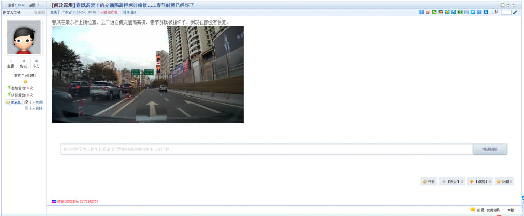 10、帖文《春风高架上的交通隔离栏何时维修……春节前就已经坏了》