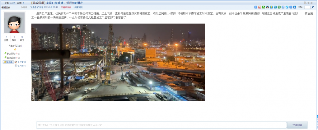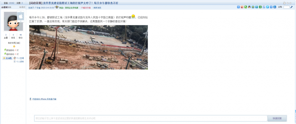 12、帖文《龙华景龙建设路附近工地的打桩声太吵了!每天中午都休息不好》