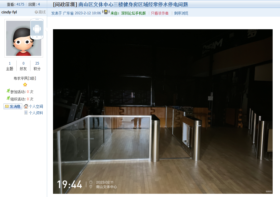 16、帖文《南山区文体中心三楼健身房区域经常停水停电问题》
