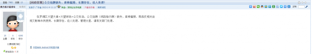 18、帖文《公交站牌缺失、座椅偏矮,长期存在,没人处理!》