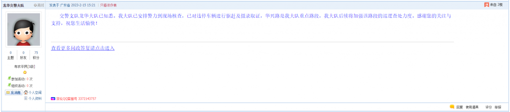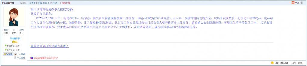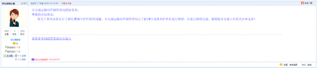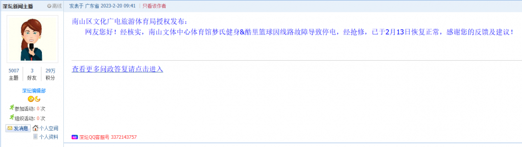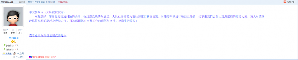 各职能单位如需对网友反映的问题进行回应,可在深圳论坛注册官方账号并通过认证,回帖进行回应,也可通过客服QQ以及热线电话,委托深圳论坛代为回应。