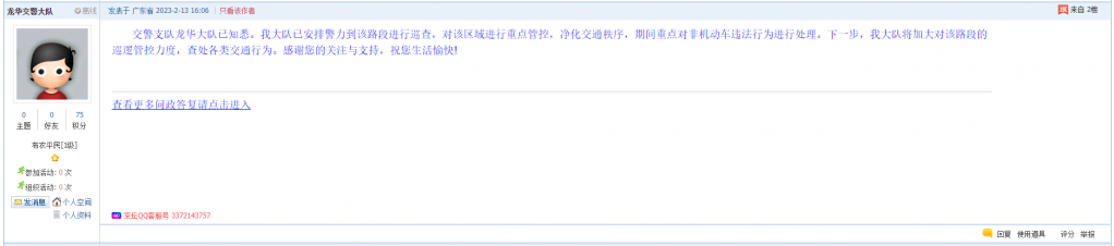据统计,2023年2月6日-2月12日,网友在深圳论坛发布问政类帖文共43篇,得到相关单位正式回应的帖文数为20篇,本期回应率最高的单位为市交警局龙华大队。