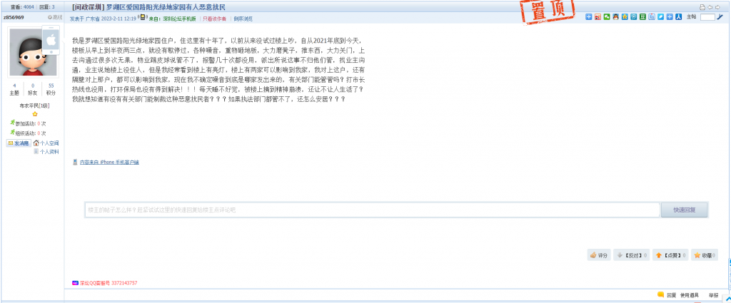 6、帖文《罗湖区爱国路阳光绿地家园有人恶意扰民》