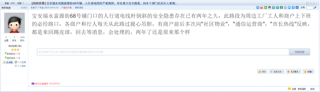 14、帖文《宝安福永凤凰富源街68号铺,人行道电线杆严重倒斜,存在重大安全隐患,向多个部门反映无人重视。》