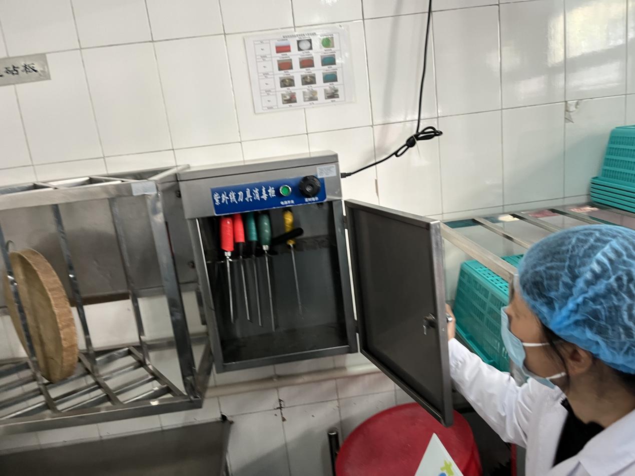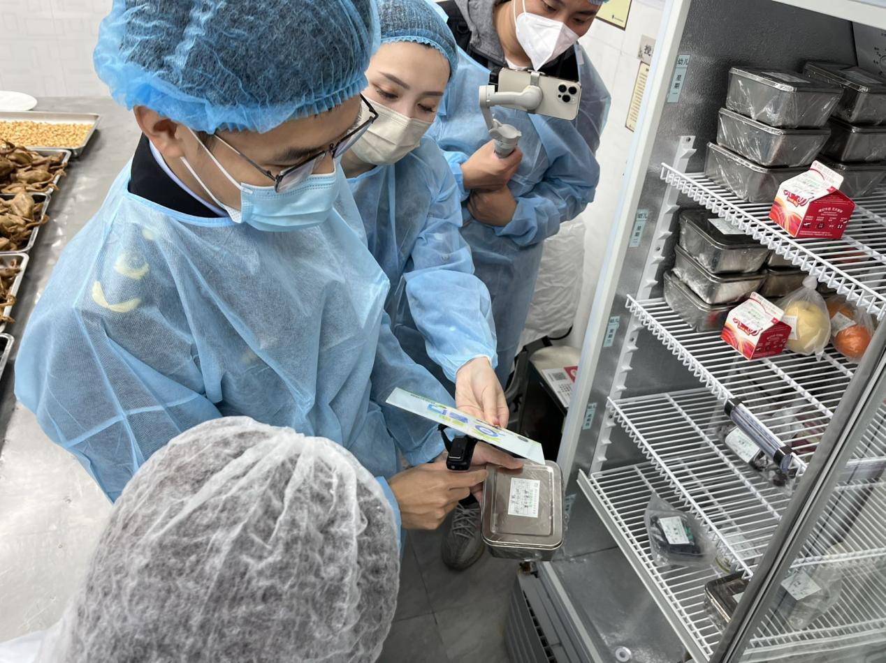 穿上防尘服、戴好发套后,执法人员一行进入后厨,依次查看各区域情况。在操作区,工作人员穿戴规范;清洗区的分区明确,刀具砧板按照颜色进行区分;留样区的样品重量均大于125g,留样时间也详细标注,符合要求。