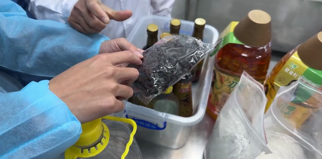 但在操作区,一包已拆除大包装的豆豉未张贴标签标识,执法人员提醒,已开封或散装的调料需要尤其注意使用期限。