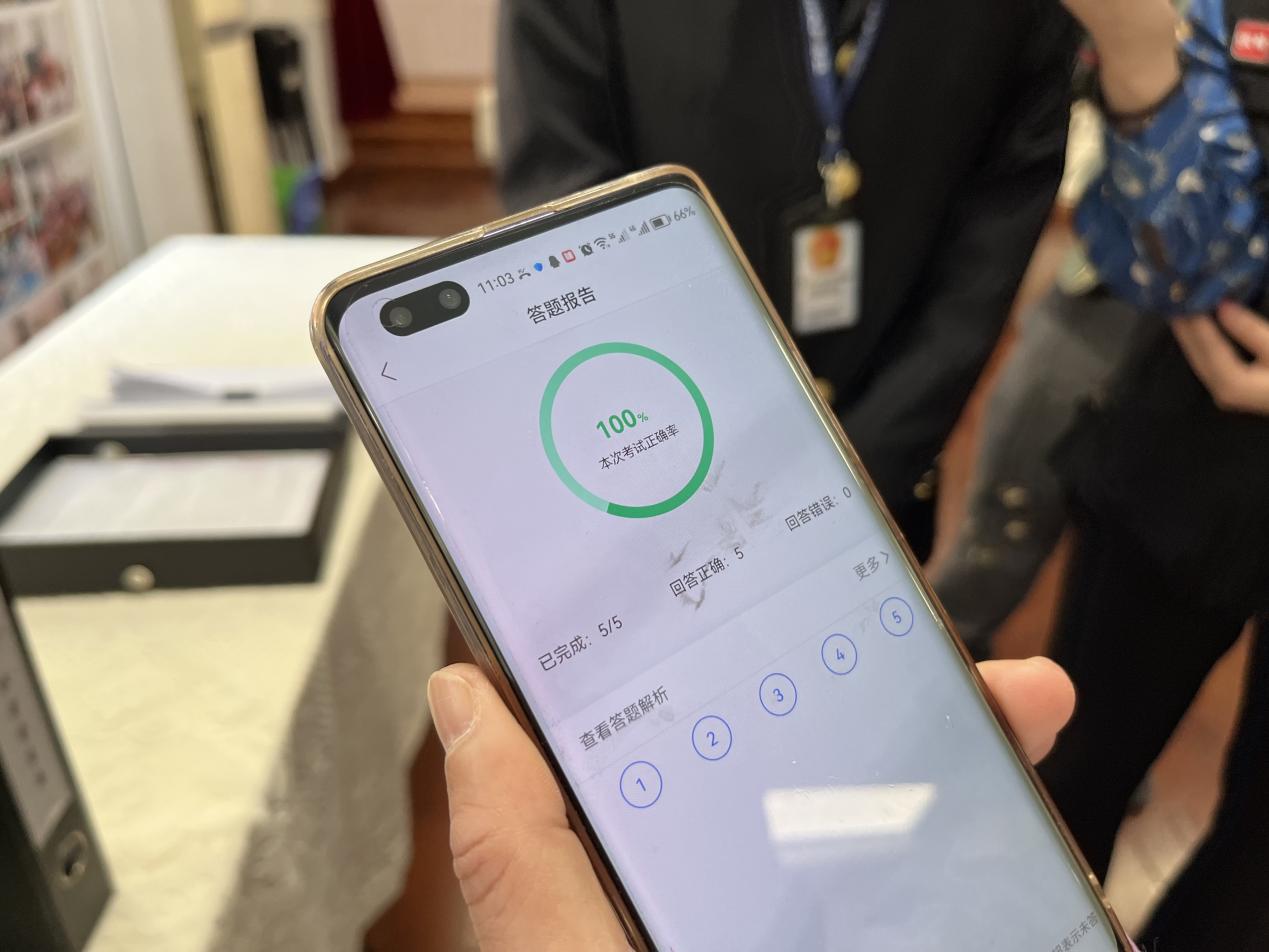 执法人员通过食安快线app对该园进行抽考,食品安全员答题正确率为100%。