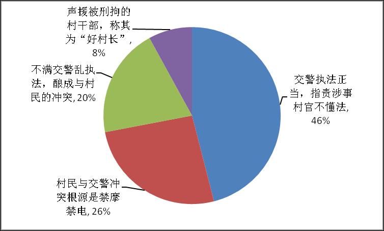 网民讨论观点集中于微博:一、多数网民认为交警执法正当,指责涉事村官不懂法;二、部分网民认为村民与交警冲突根源是禁摩禁电;三、部分网民不满交警乱执法,酿成与村民的冲突;四、少数网民声援被刑拘的村干部,称其为“好村长”。