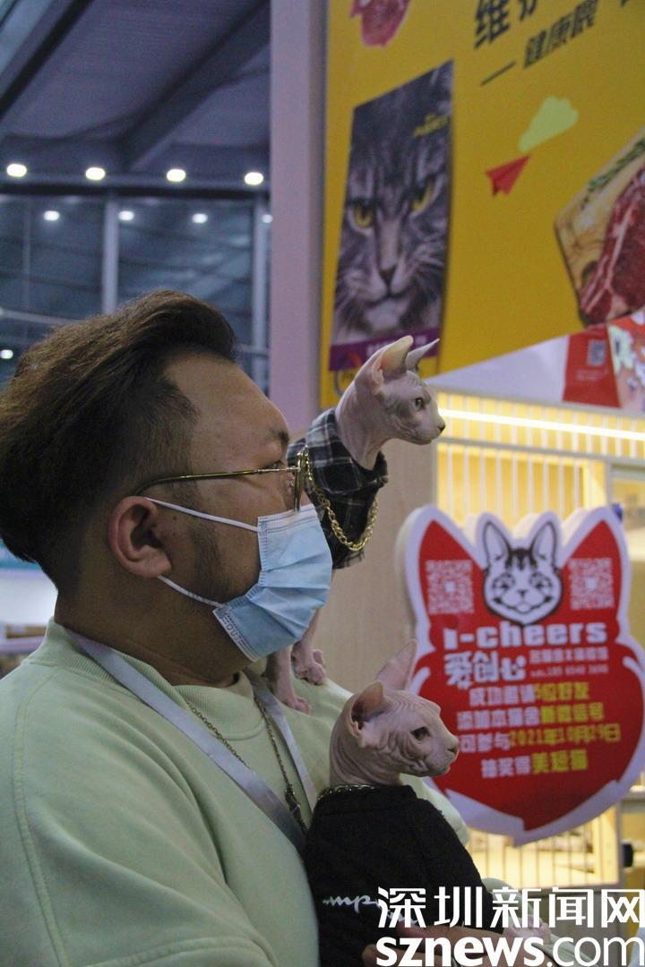 黏人的无毛猫与主人一同逛展。