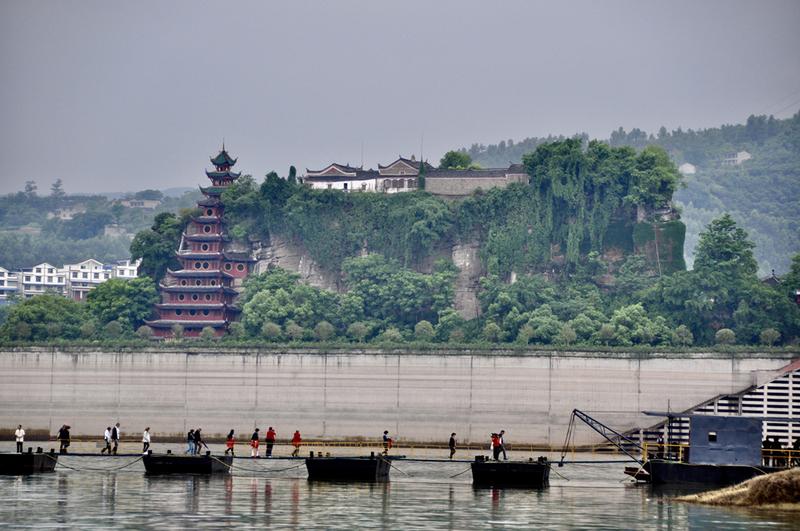 三峡库区蓄水后,石宝寨被一道水泥围堰保护起来,成为孤岛,与江岸的联系全凭一座吊桥,又被比喻为“世界最大的盆景”、“永不沉没的航空母舰”。李仁奇 摄