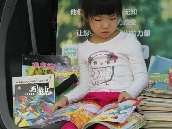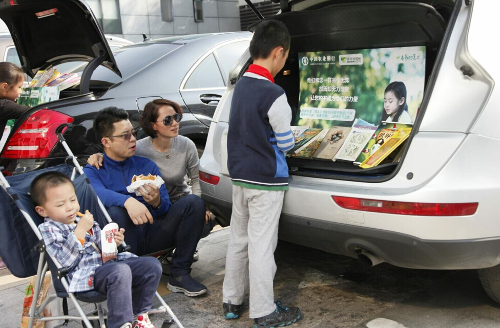 深圳市实验中学的车尾箱展位前围满了前来换书的人