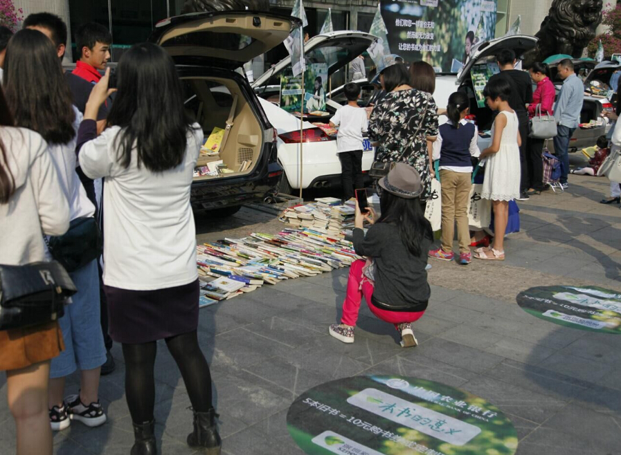 alt=" 深圳市实验中学的车尾箱展位前围满了前来换书的人">