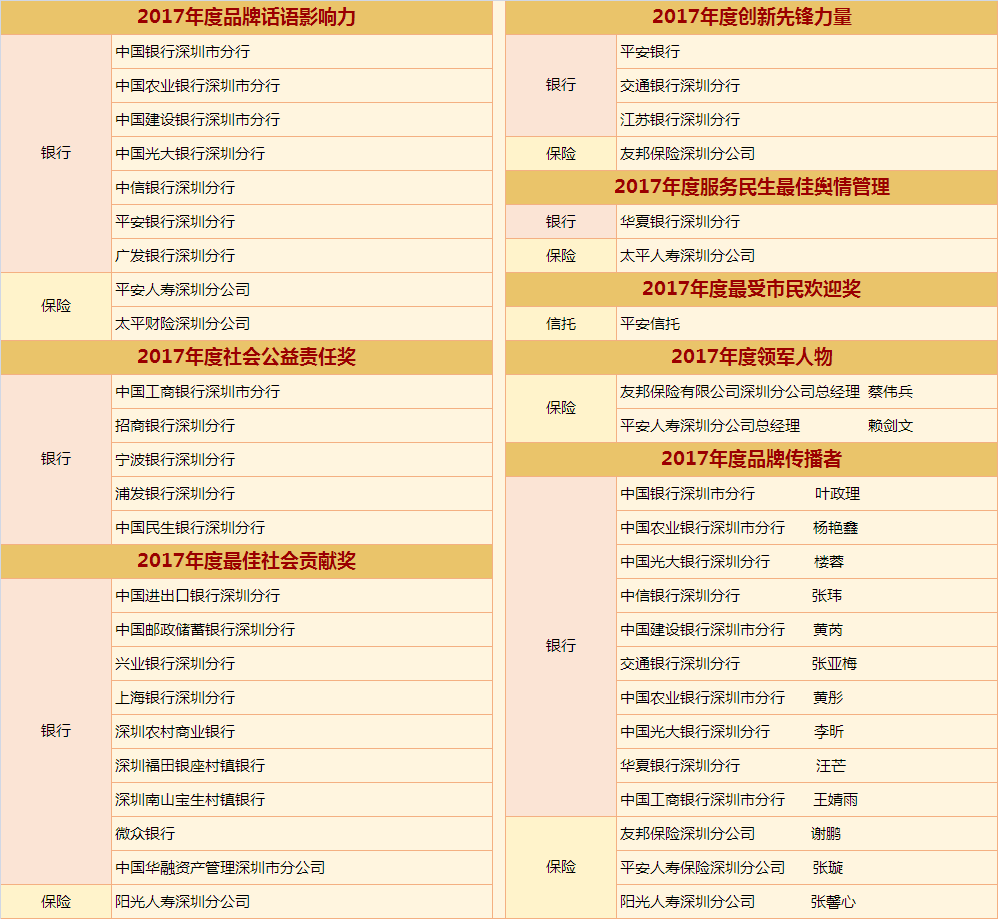 2017年,深圳金融实现快速发展。为了让金融真正回归服务实体经济的本源,真正脱虚向实,深圳新闻网将联手行业权威协会、第三方机构、媒体,以“新时代·新服务·新金融”为主题,以深圳金融机构如何回归本原、改革创新、服务实体经济为核心,从“品牌话语影响力”、“创新先锋力量”、“舆情管理 服务民生”三个角度出发,邀请众多金融机构共同发力,自觉加入金融回归服务实体经济本源这一滚滚时代洪流中来。作为一个金融公民,我们也尽一份该尽的社会责任,为市民遴选最能代表深圳本地实力及形象的金融机构,同时颁发重磅大奖:“金桐奖——年度品牌话语影响力”、“金桐奖——年度创新先锋力量”、“金桐奖——服务民生最佳舆情管理”。