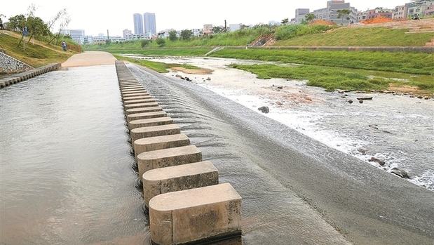 茅洲河干流(光明段)覆绿工作已经基本完成,河底群鱼悠游,沿岸绿草茵茵。