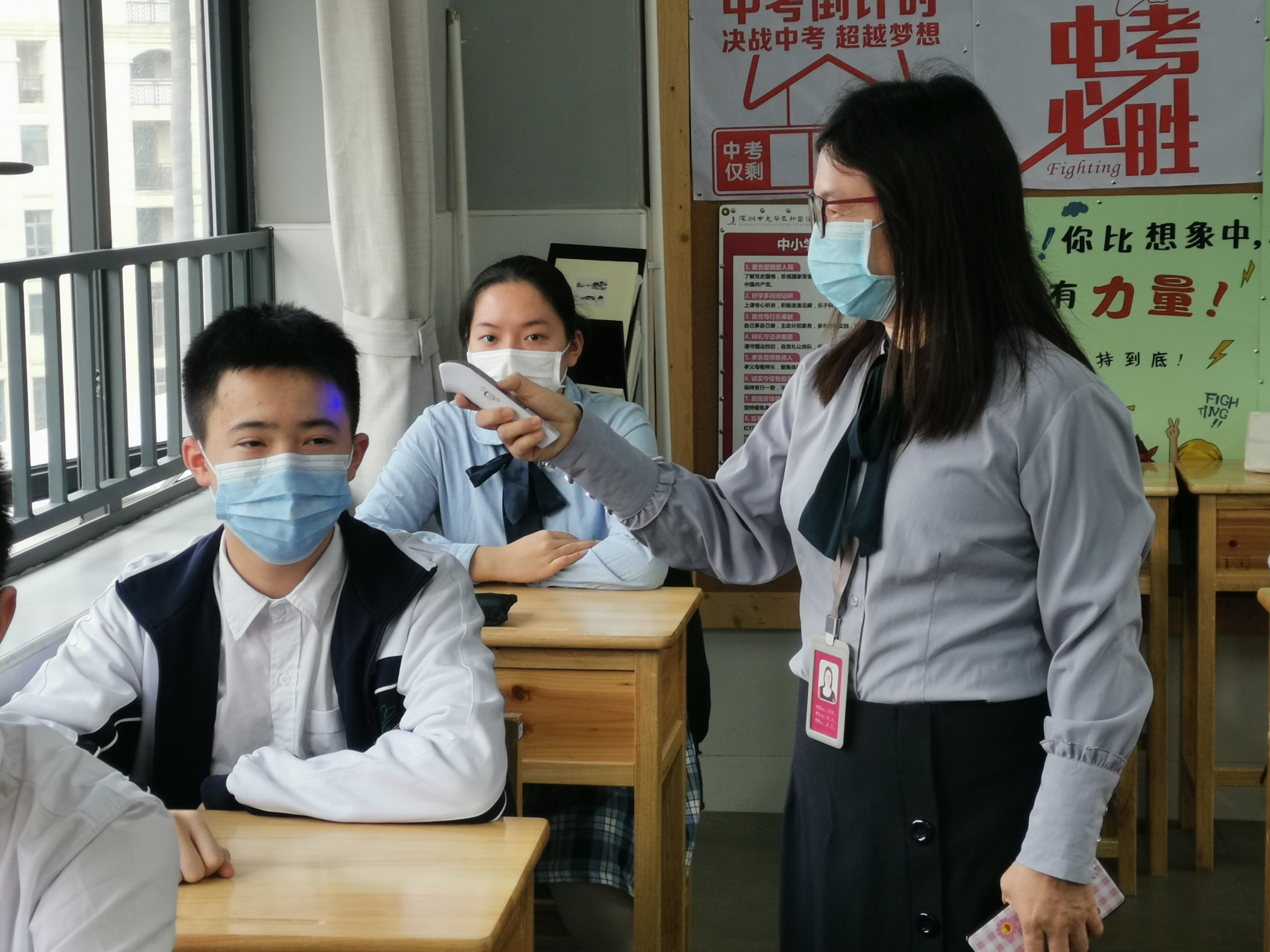 龙华外国语老师为班上学生进行体温检测