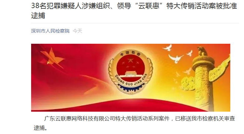 6月22日,深圳市人民检察院官方微信通报称,有38人涉广东云联惠网络科技有限公司特大传销活动系列案件,被深圳检察机关批准逮捕。