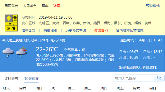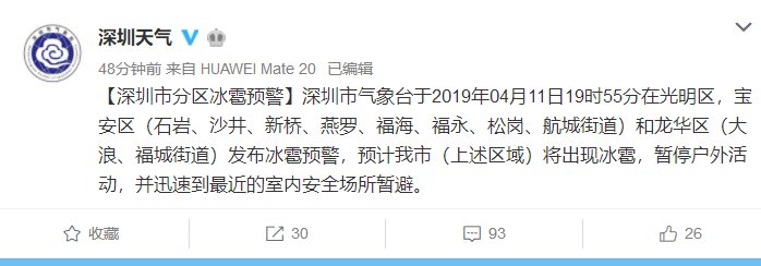 深圳市气象台于2019年04月11日19时55分在光明区,宝安区(石岩、沙井、新桥、燕罗、福海、福永、松岗、航城街道)和龙华区(大浪、福城街道)发布冰雹预警。有网友报料,松岗和东莞长安已经下起冰雹。