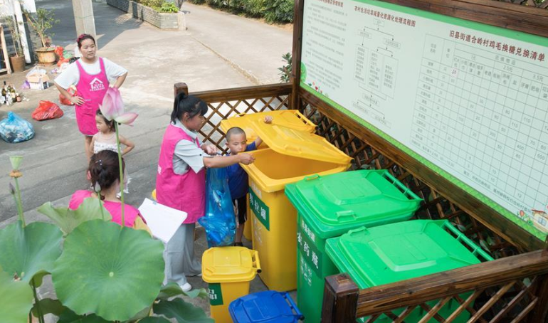 浙江省桐庐县旧县街道自2016年起推行“鸡毛换糖”垃圾分类模式,村民在指定地点投放生活垃圾可获得积分,并可用积分兑换生活用品、书籍等。