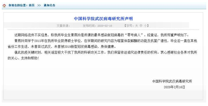 日,一则关于“中国科学院武汉病毒研究所一名女研究生黄燕玲是新冠肺炎零号病人”的消息引发社会热议。武汉病毒研究所官网16日发布声明,称黄燕玲未曾回过武汉,未曾被2019新型冠状病毒感染,身体健康。