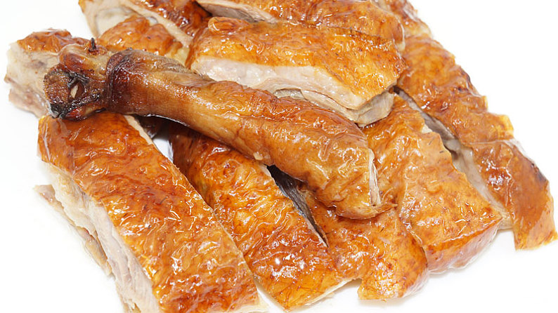 烧鹅外表金黄鲜亮,香气浓郁,皮香脆可口,肉汁中带有韧性,在舌尖上流淌。