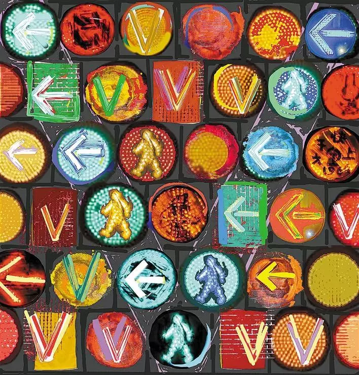 梁宇透露,这件作品的创作四易其稿,将信号灯所指代的“社会规则”加以排列强化,以此强调“秩序”本身在与疾病博弈混乱环境中的重要性。作品以浓烈的对比色彩、紧密排列的几何图形试图传达当下人们的紧张情绪和焦虑心态。同时,信号灯中“行走”、“前进”、“Victory”的提示标识,被清晰地提炼出来,成为能让画面安定的因素,望带给观者一点思绪的宁静与心灵的慰藉。
