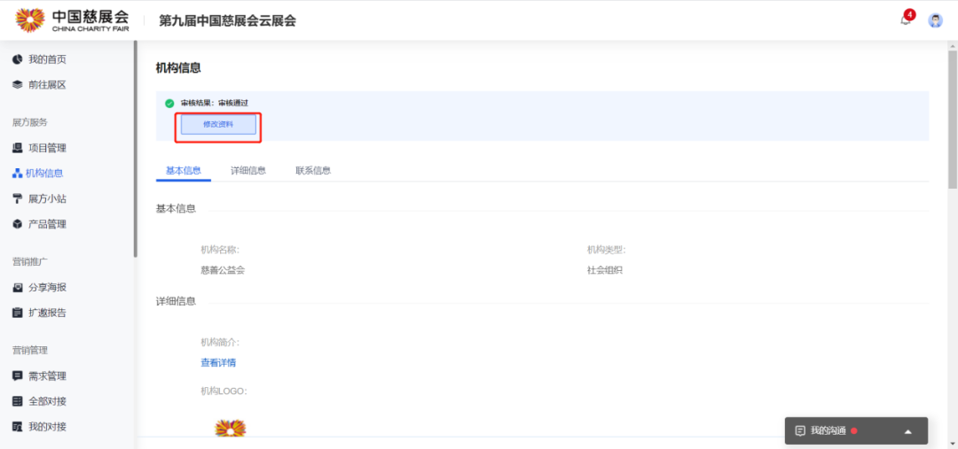 第一步:点击左侧功能栏『机构信息』,点击『修改资料』进入机构信息编辑页面,完善机构信息;