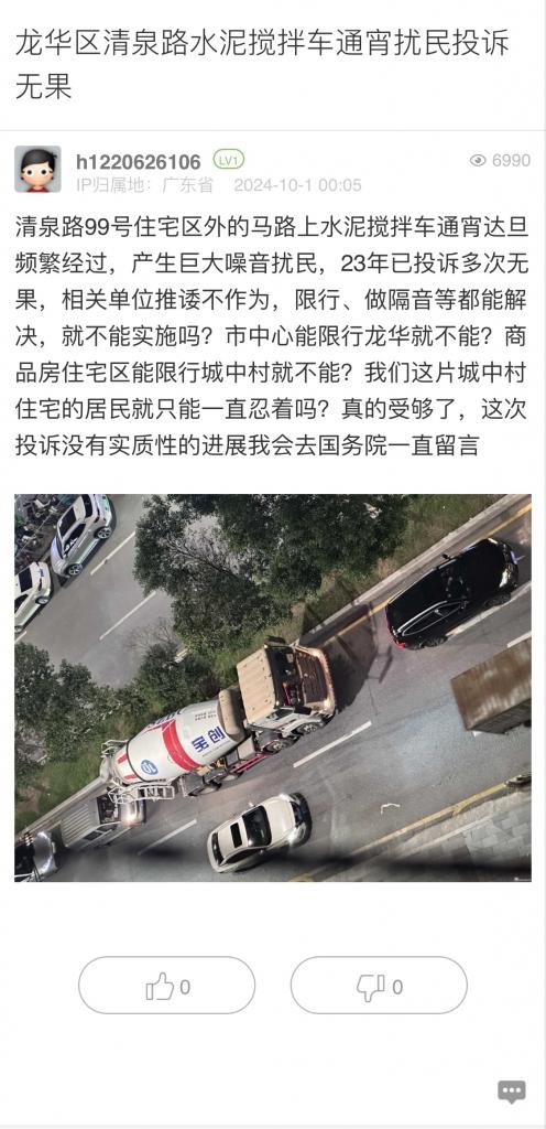 34. 帖文《龙华区清泉路水泥搅拌车通宵扰民投诉无果》