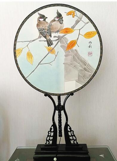 景丽莉创作的团扇《晨鸟飞啼栖枝头》。
