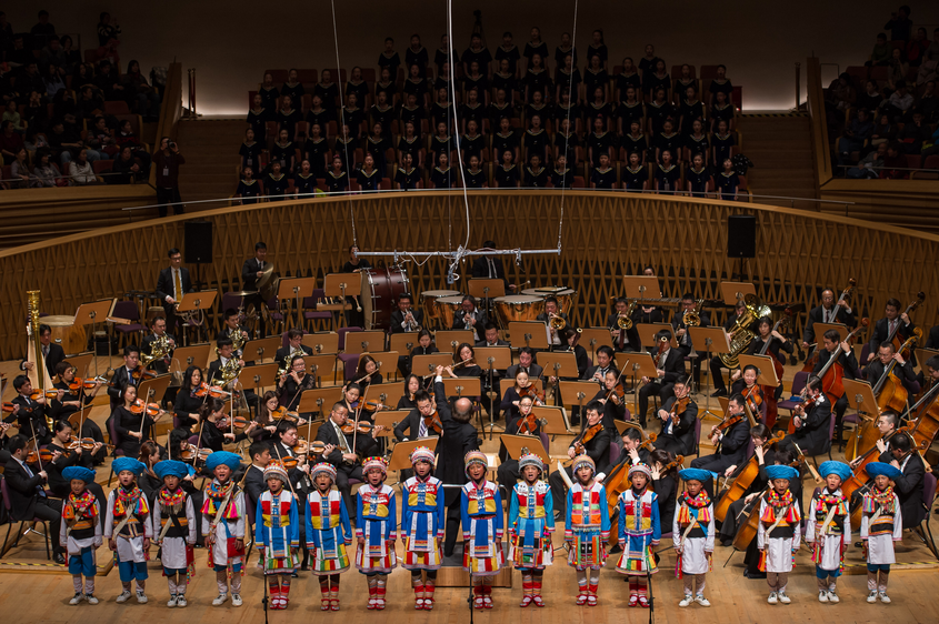 16名太平洋保险希望小学的傈僳族学生在“乐行天下”上海新年音乐会舞台上唱响自己的音乐梦想