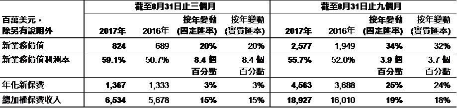 友邦保险三季度主要财务概要