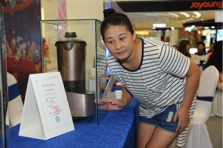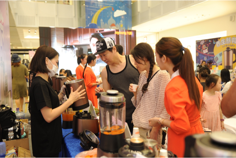 消费者在现场亲自测试九阳静音破壁机YJ08的声音