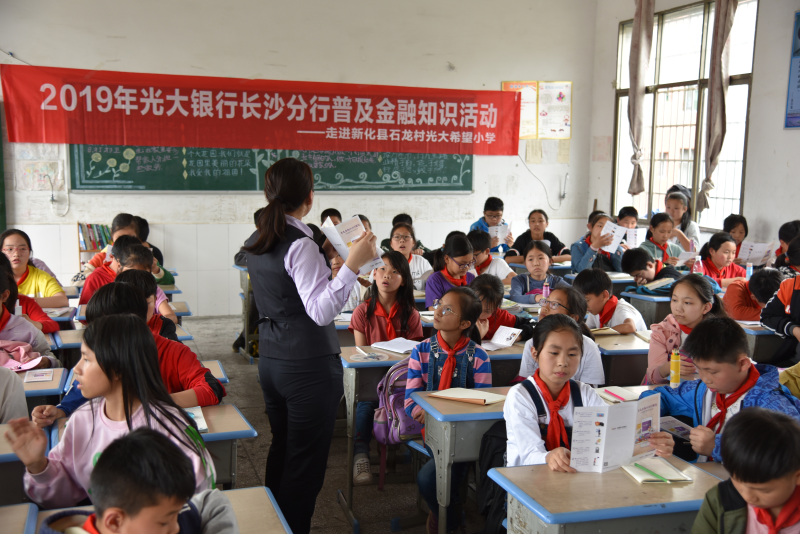 此外,近年来长沙分行还积极开展“小小银行家”送金融知识与关怀慰问进山区活动,定期走进新化县石龙村光大希望小学、新田县苦志育才学校,为师生们普及金融知识,让金融知识和服务在贫困山区依然能开花结果。