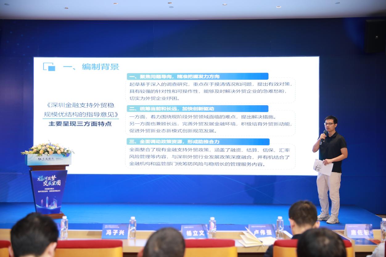 在宣讲会上,国家外汇管理局深圳市分局经常项目管理处从加大进出口信贷支持、优化跨境结算服务、丰富配套金融支持、抓好工作落实四个方面宣讲了金融支持外贸政策,鼓励银行提升金融服务水平、积极支持实体经济发展。