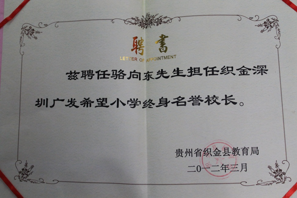 2013年,在骆向东的退休仪式上,织金县教育局将一张希望小学终身名誉校长的聘书,郑重交到了他的手上。“我很荣幸能代表广发银行深圳分行党委去推动这件事,但公益事业任重道远,我相信爱心基因会在广发一直传承下去。”事实也正如骆向东所言,从1998年筹建希望小学至今,一代代广发人身体力行,让爱心助学一棒接力一棒。