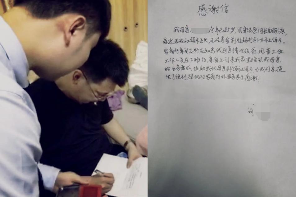 深圳农商银行观澜支行“窗口”移至“家门口”。2024年5月,观澜支行接到客户翁先生反馈其85岁母亲的社保卡不慎遗失,急需补回卡取养老金。但阿婆长期卧床,行动不便,无法出门。针对此情况,观澜支行工作人员告知客户,可通过上门核实阿婆的情况及意愿后,由其代母亲办理。后续在确认客户时间后,观澜支行安排员工上门核实阿婆委托儿子办理业务的意愿。在确认其意愿清晰真实后,阿婆的儿子到网点为其代办了相关业务。客户为此手写感谢信对工作人员的贴心服务表达了感激。