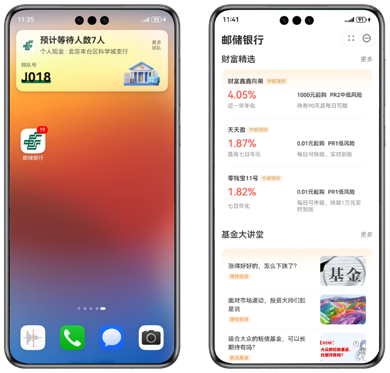 深度拥抱鸿蒙系统,打造服务新体验。邮储银行鸿蒙版手机银行、邮储信用卡App不仅全面覆盖Android版和IOS版全部功能,为客户提供“三端”一致的客户体验,更借助鸿蒙操作系统的新特性,为客户打造出多项新体验。例如,在“实况窗”基础上实现的网点预约,可向用户展示网点排队信息;基于鸿蒙元服务的邮储银行服务卡片让客户无需启动App即可浏览最新的投资理财产品。