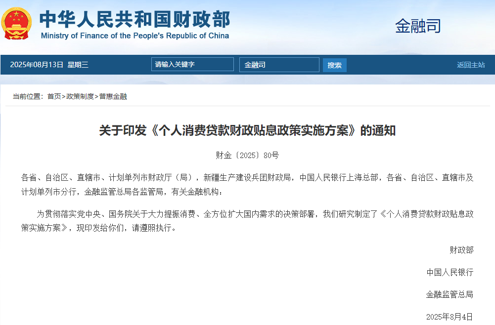 深圳新闻网2025年8月13日讯(记者 汤莎)近日,财政部、中国人民银行、金融监管总局印发《个人消费贷款财政贴息政策实施方案》(以下简称方案),中央及省级财政将对符合条件的个人消费贷款实施贴息。