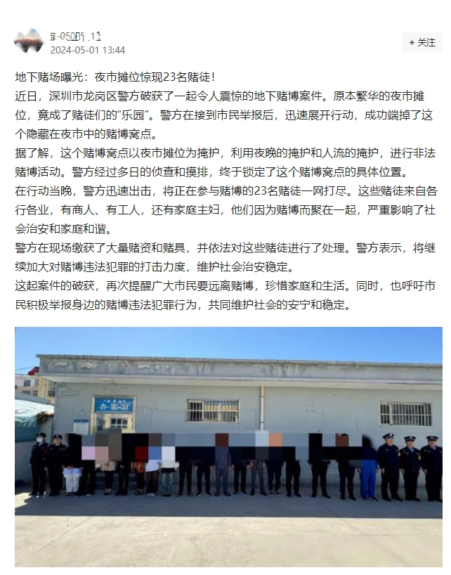 有网民在某社交平台发帖称:“近日,深圳市龙岗区破获了一起令人震惊的地下赌博案件。原本繁华的夜市摊位,竟成了赌徒们的‘乐园’。”龙岗区相关部门第一时间对该内容进行核查,确认此消息不实,龙岗区没有发生此类案件。