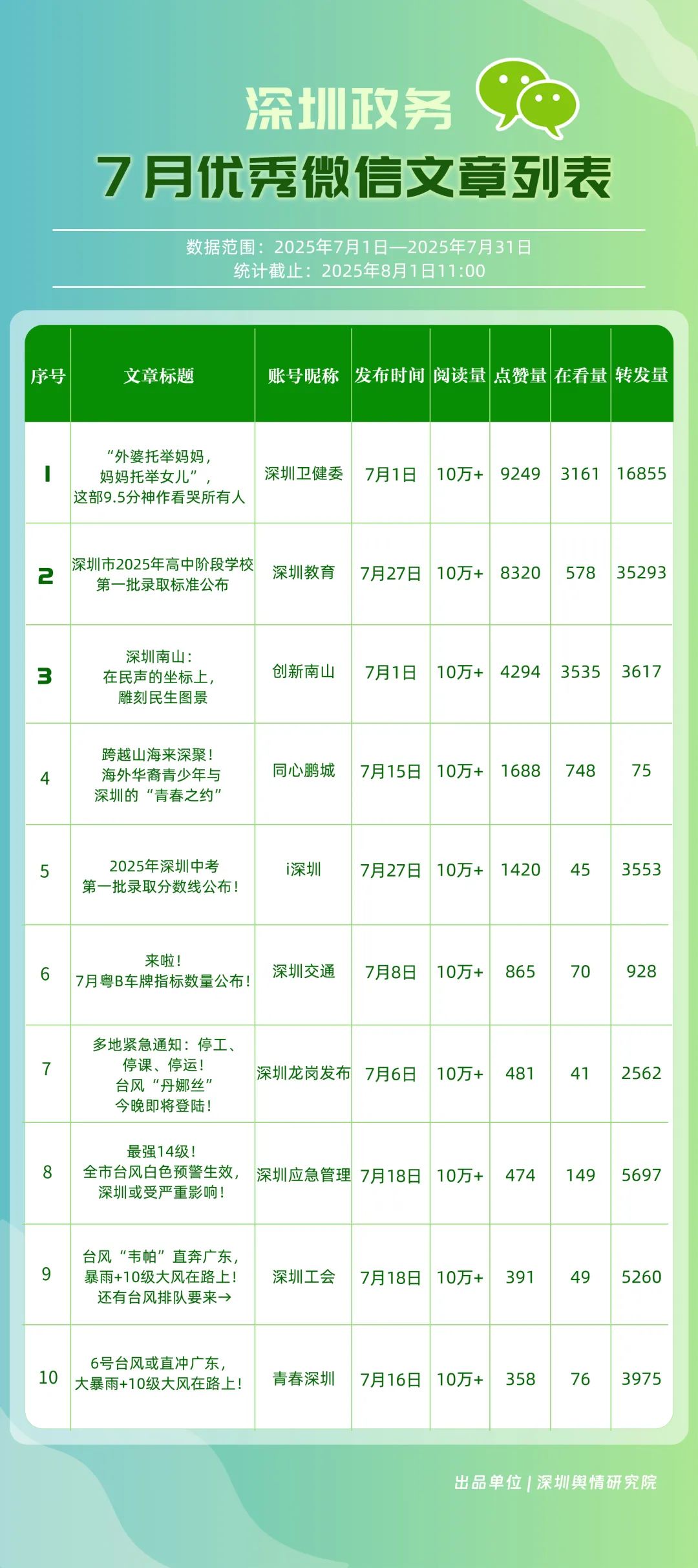 7月,“深圳幸福福田”“深圳消防”“深圳卫健委”“深圳疾控”“创新南山”“罗湖发布”“深圳应急管理”“滨海宝安”“深圳龙岗发布”“坪山发布”共10个政务头条号入选“优秀政务头条号”榜单。“深圳幸福福田”“深圳消防”凭借优质内容持续吸引用户关注,稳居前二;“深圳卫健委”表现亮眼,评分达92.68分,排名较6月有所上升;“深圳疾控”同样进步明显,在疾病预防控制信息传播上发挥了重要作用。“创新南山”“罗湖发布”“深圳应急管理”等上榜账号,也各展所长,始终将优质内容作为核心抓手,成为政务新媒体领域内容创作与传播的典范。
