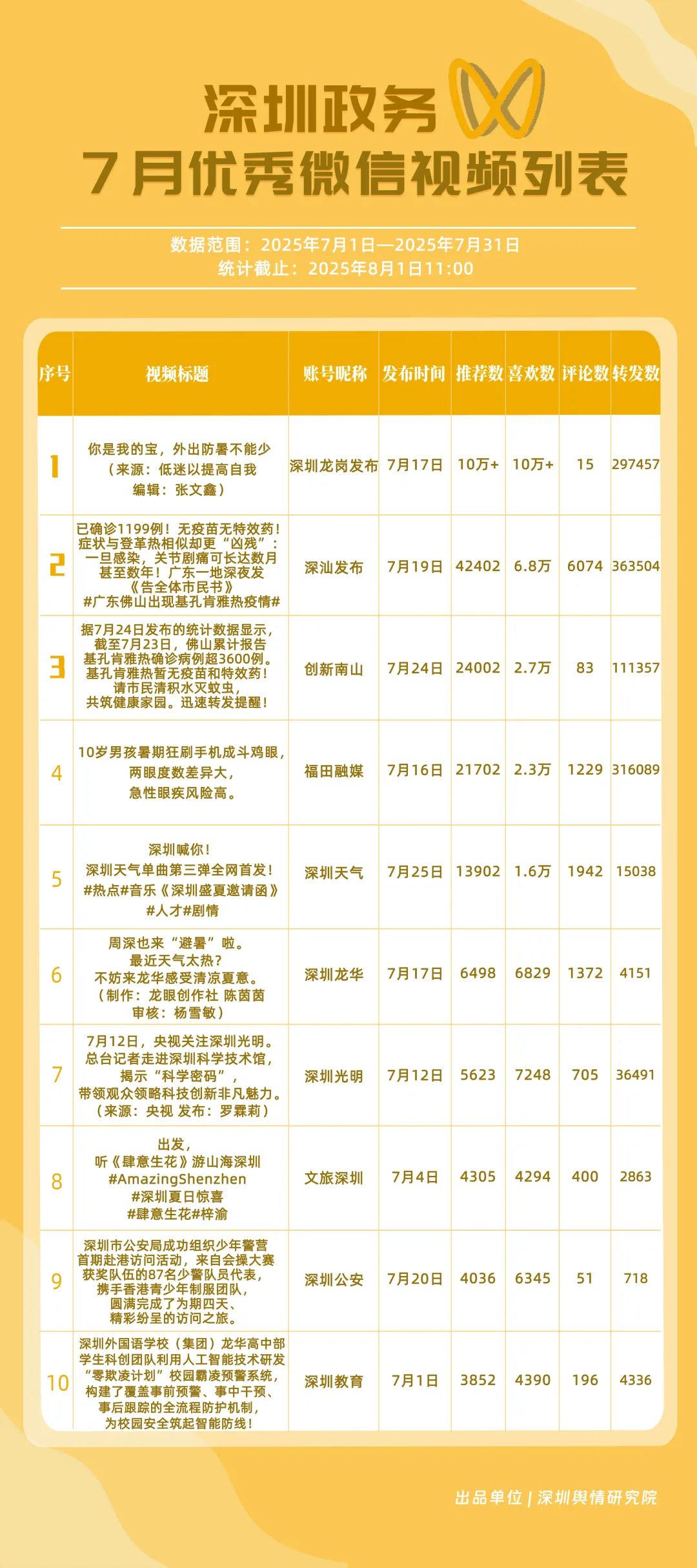 7月,获得“深圳优秀政务微信视频号”称号的是“深汕发布”“深圳龙岗发布”“福田融媒”“深圳天气”“创新南山”“深圳交警”“文旅深圳”“深圳龙华”“深圳教育”“深圳光明”。其中,“深汕发布”持续输出热点内容,收获大量网民关注、互动,三项指标均达满分,位居榜首;“深圳龙岗发布”“福田融媒”紧随其后,总分均超过95分,两账号通过多样化的内容呈现,在活跃、互动及传播等方面均有出色表现;“深圳天气”“创新南山”“深圳交警”等账号也获得不错成绩,总分均在85分以上。上榜微信视频号精准把握平台特性,高效传递了政务信息,更成为展现城市活力、拉近政府与民众距离的重要窗口。
