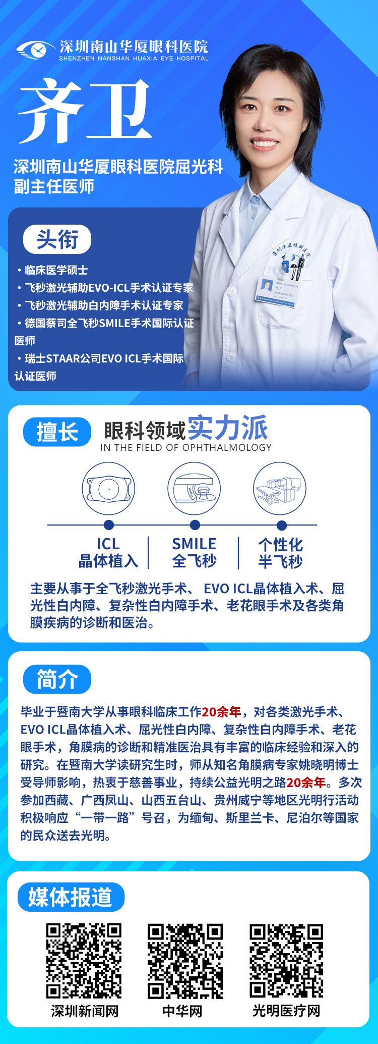 毕业于暨南大学的齐卫主任,师从知名角膜病专家姚晓明博士,从求学时起就对眼科事业的热爱。临床工作中,而且她在激光手术、EVO ICL 晶体植入术、屈光性白内障手术等领域积累了深厚造诣。